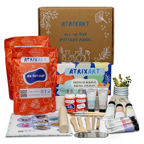Specification: Atrixart All in One Pottery Kit for Beginners. The Craft Kit has 2kg Air Dry Clay for Adults, How to Guides & Templates, Paints and Modelling Clay Sculpting Tools (Pastel Colours)