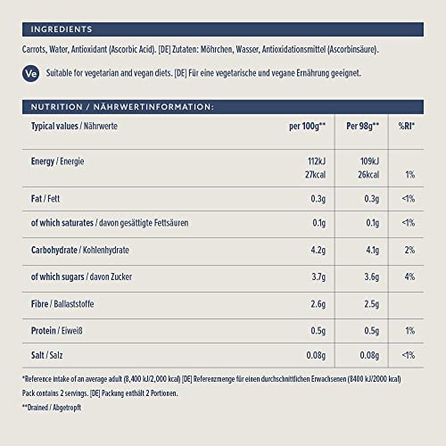 by Amazon Baby Carrots in Water, 300g. For Best Before, see lid. Store in a cool, dry place. Once opened, transfer to a non-metallic container, cover and keep refrigerated and consume within 2 days.