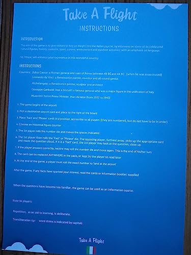 Specification: ITALY: the Wonders of Europe and Travel – a Quiz and Language board game, for adults and clever children. WARNING: this is not a fluffy game – it’s to learn and think…!