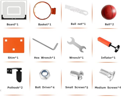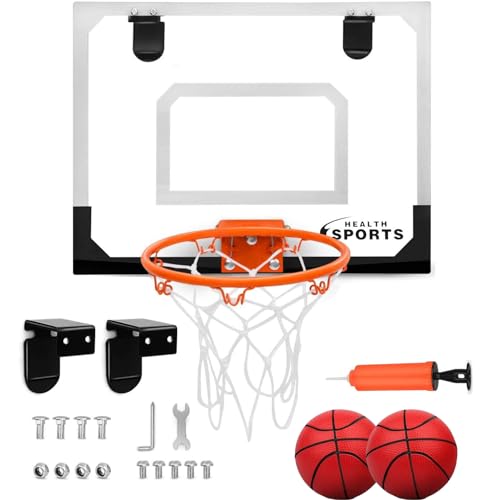 [Complete Set] This over door basketball hoop is complete set including basketballs backboard, hoop (ring and net), 2 basketballs, pump, other mounting accessories and instruction. Using these, you can easily finish the installation process.