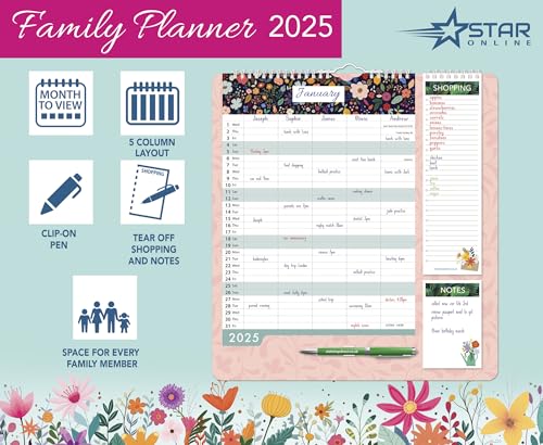 Specification: Star Online 2025 Calendar Family Home Organiser Year Planner with 5 Column Layout Gift Floral & Leaf Design – Purple Flower